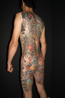 "... I had completely forgotten [about sending in the photo] until I found the picture I took for you on my camera... This was done by Junii at the Diamond Club in San Francisco. [Bill Salmon, Junii's husband, is the studio owner]. She does amazing line work. She's also incredibly conscientious about design and her clients. For both my tattoos, she spend a lot of time talking with me, looking at the 20 pictures I had brought in of bits or aspects of what I wanted, then went off and did her own research, always coming back with exactly the right drawing.